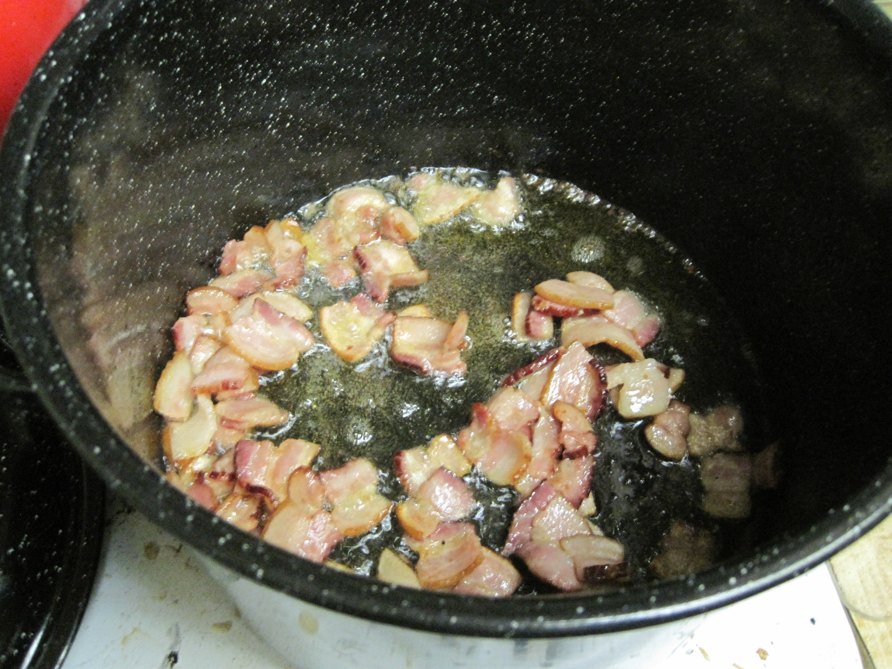 First I cooked the bacon in the olive oil until crispy. Once it was done cooking I removed the bacon from the pot and kept the grease in. Then I added all the onions to the pot and the butter.