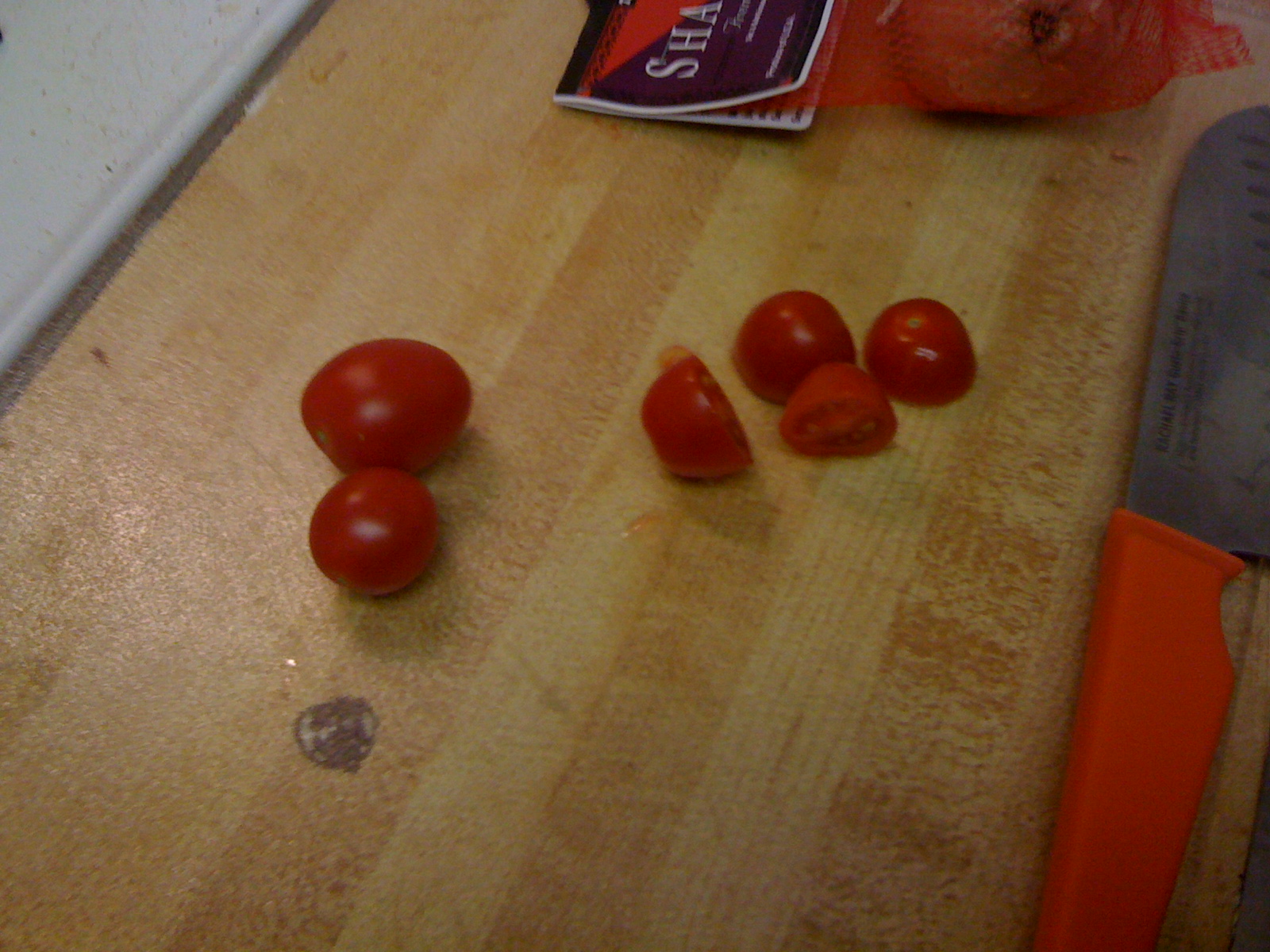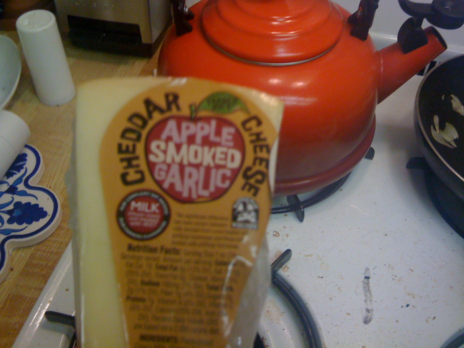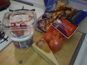 I went to the cheese section and picked up a smoked apple wood cheddar with garlic. The cheese should stand out. I didn’t want to stray too far from convention but its not a Kraft bag so I figured it was inventive enough. I could imagine things like goat cheese or Brie or something really off beat in the future. Next I grabbed a shallot, and cherry tomatoes.