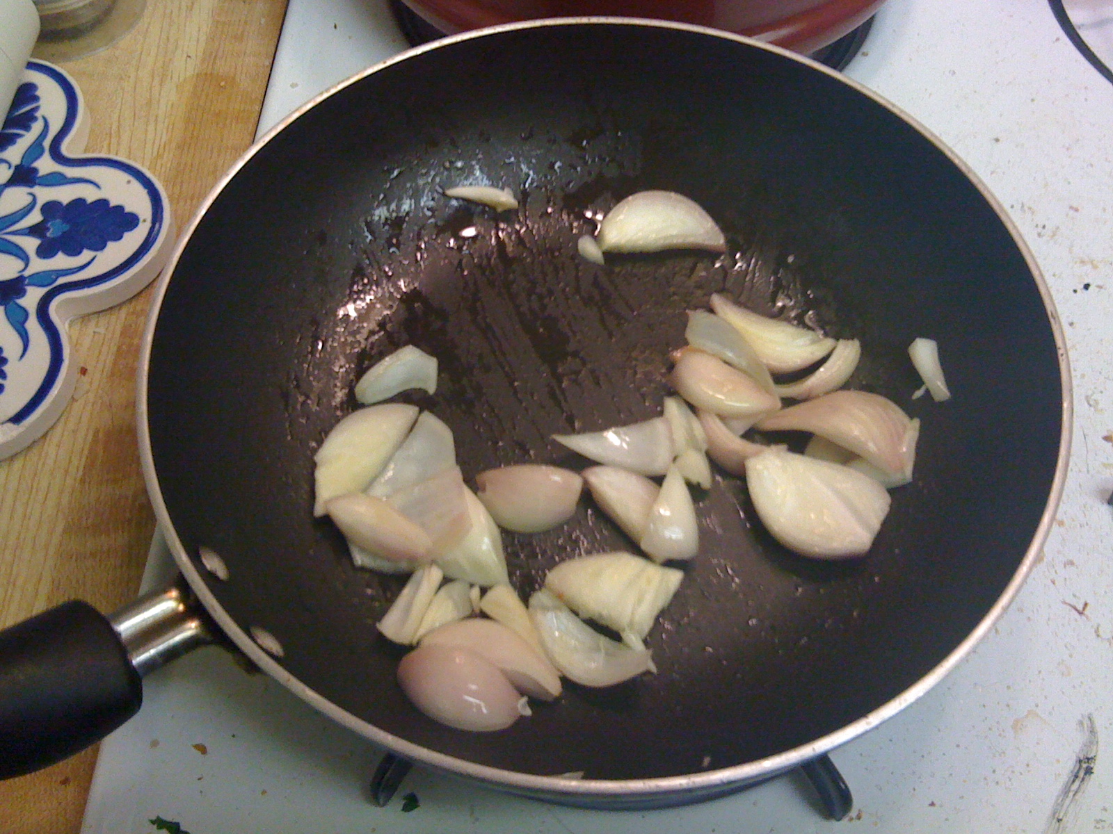 Once home preheated the oven to 350 and cooked one sliced shallot in a pan with a dollop of EVO over medium heat until softened (3 mins) and seasoned with salt and pepper- one pinch each.