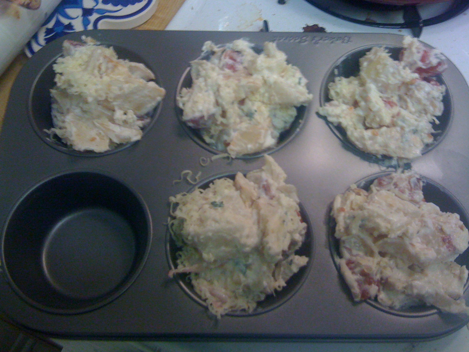 I put the mixture in a large size no stick muffin tin (in a sad effort to have portion control). And put it in the oven for 35 mins, checking periodically.