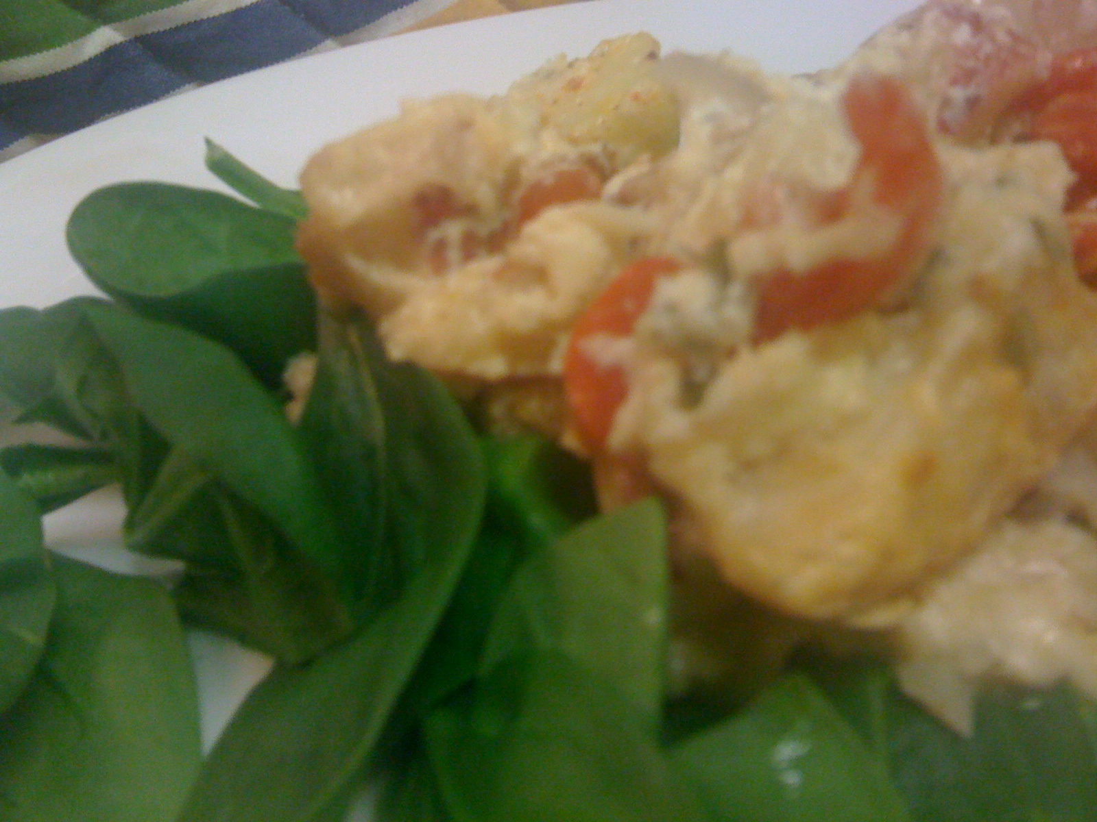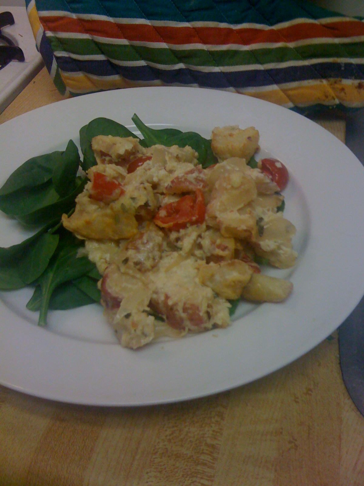In the meantime I made a bed of spinach for the potatoes to rest on and waited for the deliciousness to emerge from the oven. 35 mins later my apartment was enveloped in the rich aroma of cheese, glorious cheese. I removed the potatoes from the oven (they should be slightly browned on top) and let them cool for 5 mins before placing them on the spinach.