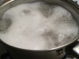 The recipe is steak with a potato salad. I start off the potatoes in salted water. Once the water boils I reduced the heat and cover. Let the potatoes cook for 20 mins until cooked through.
