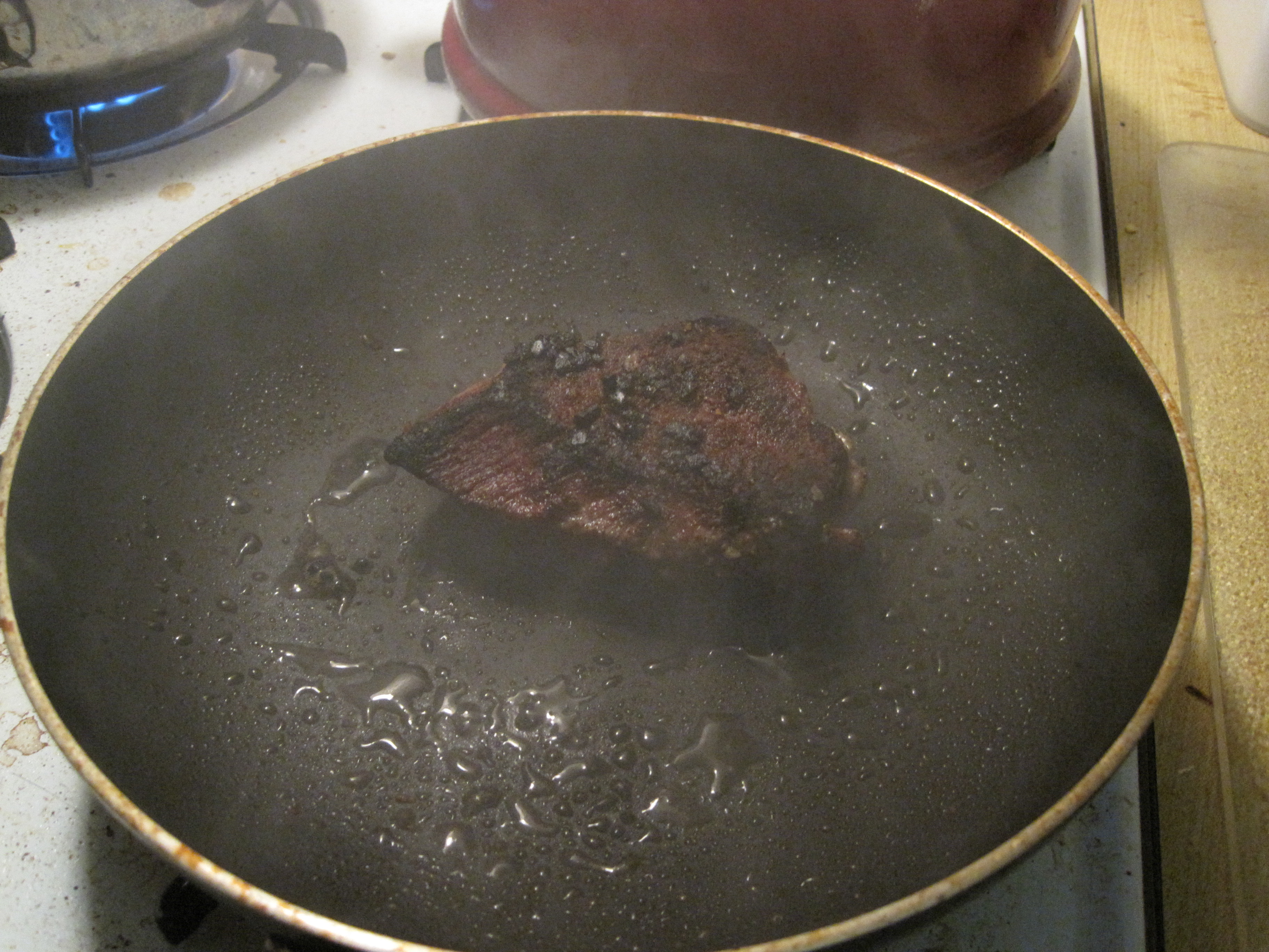 Ok, so it seemed easy enough. I followed the instructions and thought everything should be fine. I had the fan going over my stove and noticed that there was some mild smoking. By the time the 5 mins passed for the first side I noticed that my apartment was oddly smokey (it smelled good, but didn’t look so great). Suddenly my apartment was really smokey! I opened the sliding glass door. Luckily the fire alarm didn’t go off (the ultimate cooking disaster). Not sure that’s actually a blessing though. So, if my apartment was full of smoke there would be no alarm? This made me a bit uneasy but I continued cooking.