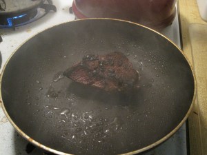 Then I started the steak. I seasoned the meat with salt and pepper and added minced garlic (the recipe didn’t call of it, but I love garlic so why not?). I put a dollop of olive oil and then cooked the steak for 4 to 5 mins on each side (so that the meat would be medium rare).