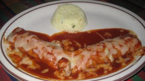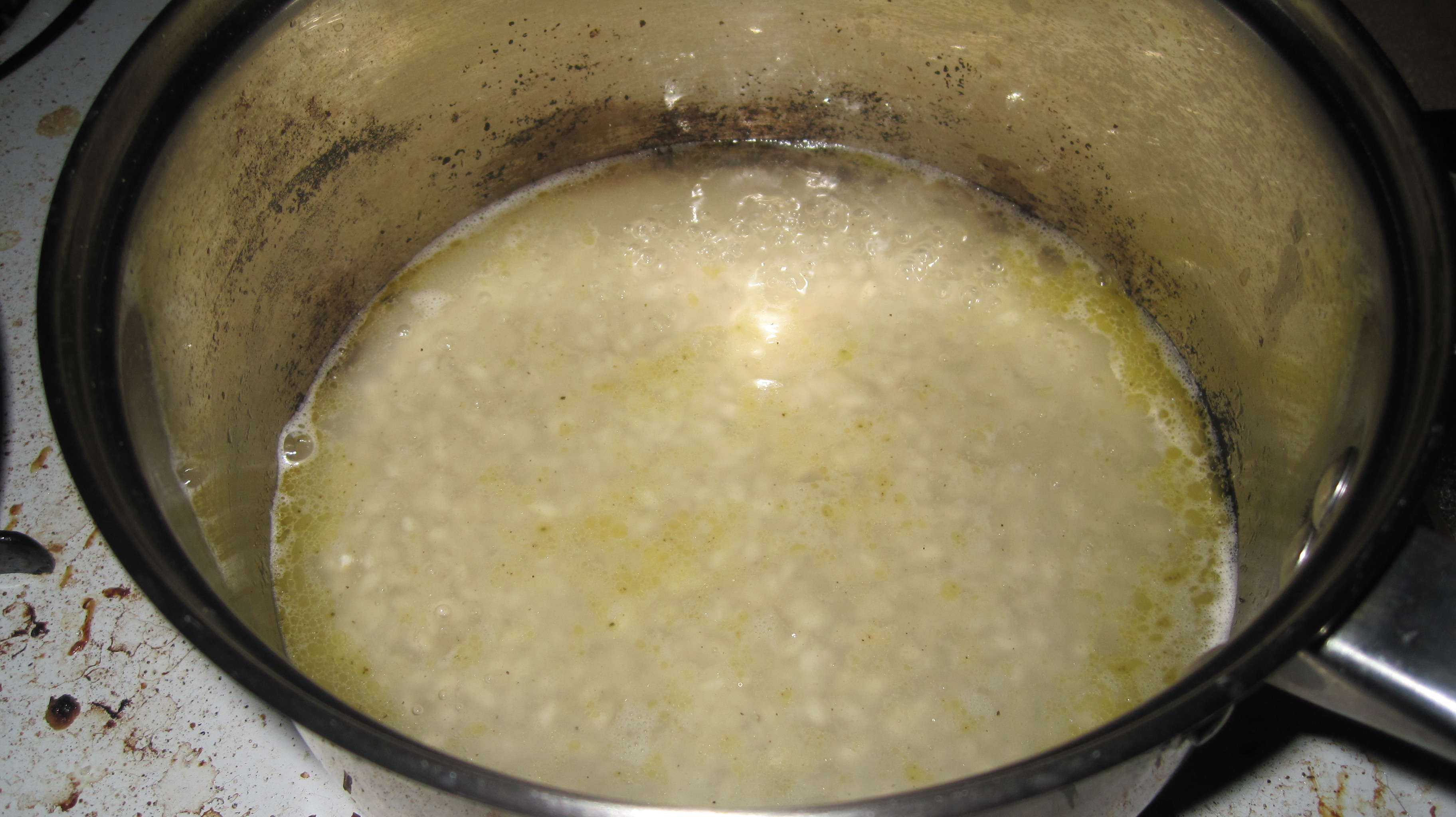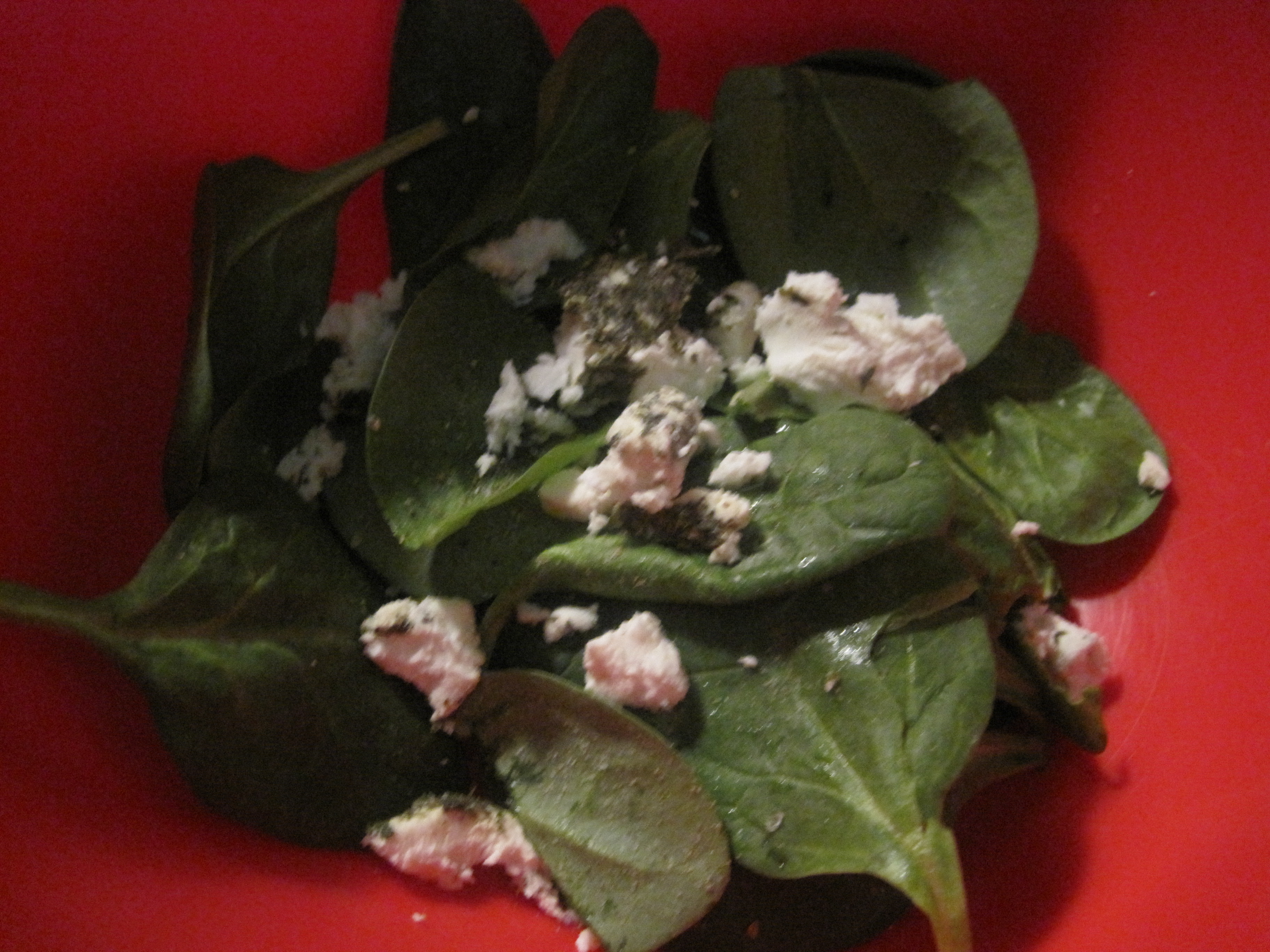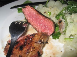 So, I forged on and the steak actually turned out pretty good. I think that the steak smoked so much because of the garlic. After I took the steak off I worked on my salad. Instead of bib lettuce I used spinach, because that’s what I had on hand. I added herbed goat cheese, instead of blue cheese, salt, pepper, olive oil, and cider vinegar. Once the potatoes were done I ran cold water over them and then mashed them with a fork in the salad.