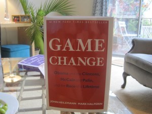 Today I walked to the library in the rain which was wonderful. I love walking in the rain with music and a latte because it reminds me of Boston. When I got home my new fun reading book had arrived, “Game Change: Obama and the Clintons, McCain and Plain, and the Race of a Lifetime”.