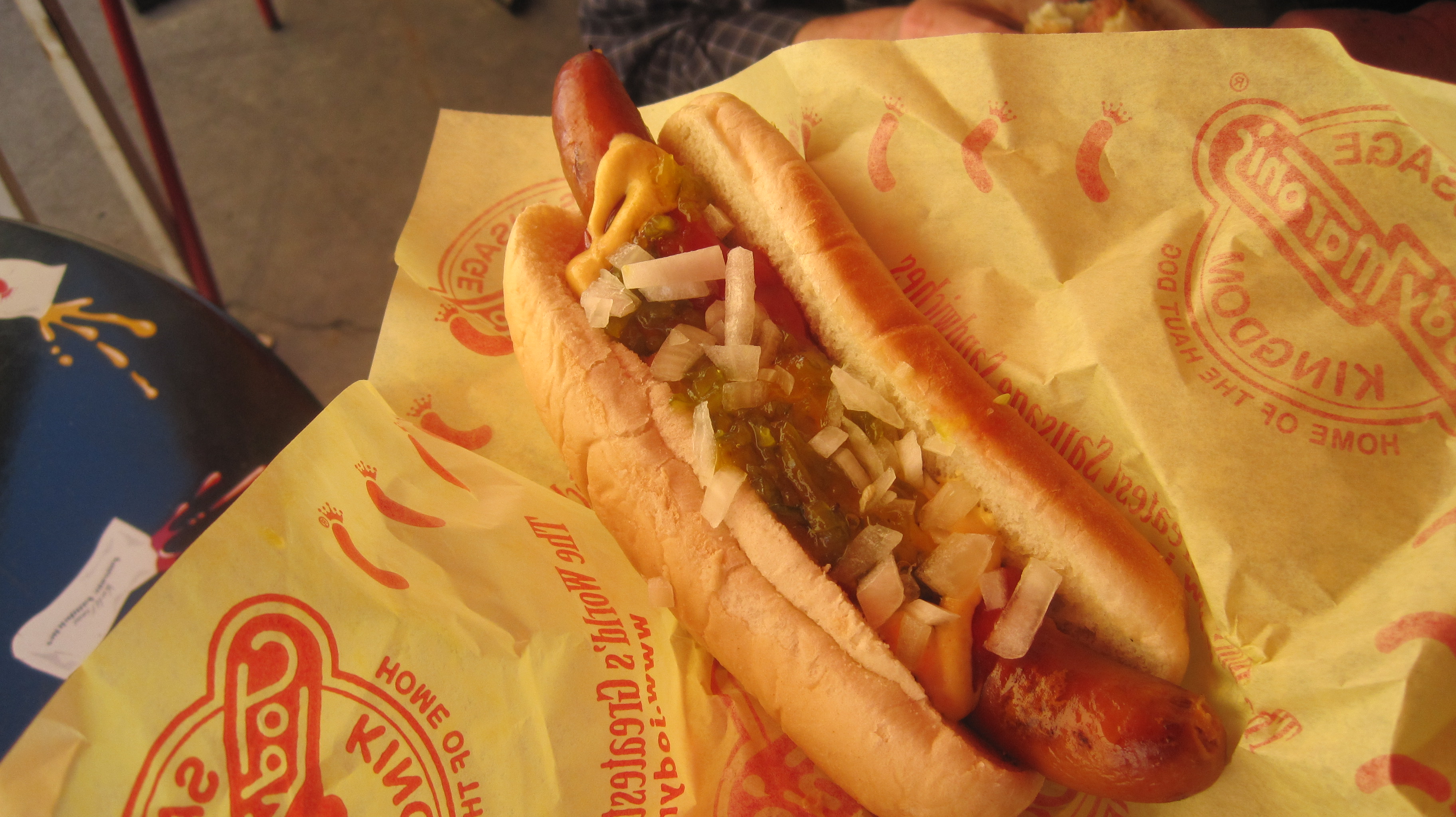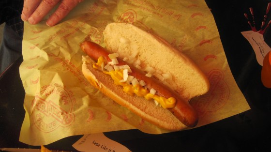 I was a little less by the book. I had the works: onions, relish, ketchup, and mustard. It was such a good hot dog! Totally grilled to perfection with a great combo of ingredients.