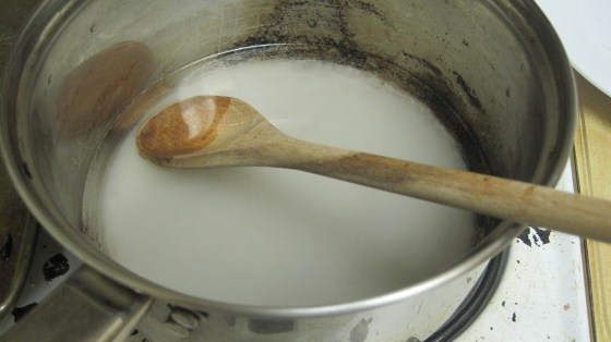 I took equal parts water and sugar, one cup each, and heat it until the sugar dissolves. Once the sugar has all dissolved, the syrup will be clear at that time, turn off the heat and let the syrup cool. After turning off the heat, let a container of mint sit in the syrup until the syrup has completely cooled off.