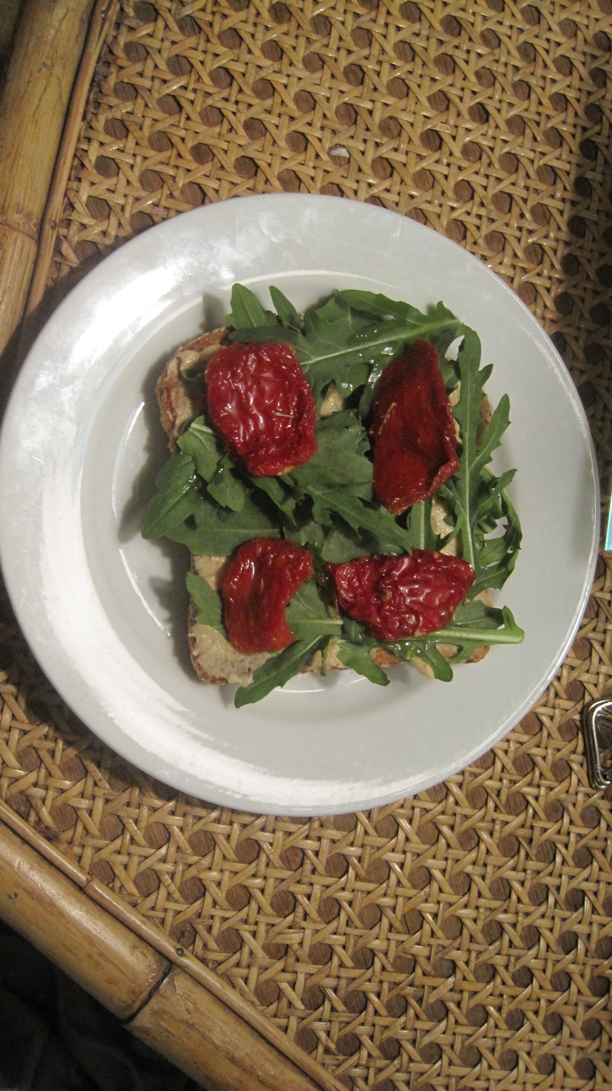 After yoga I caught up with a taco truck I saw on my way into yoga. How awesome that it was still there, right? I was kinda thinking about it all through class. I know, I have a sick obsession with food trucks. I ate a taco so quickly that I didn’t get a picture. When I got home I knew I should eat something else so I had this piece of Ezekiel bread with hummus, arugula, and sun dried tomatoes.