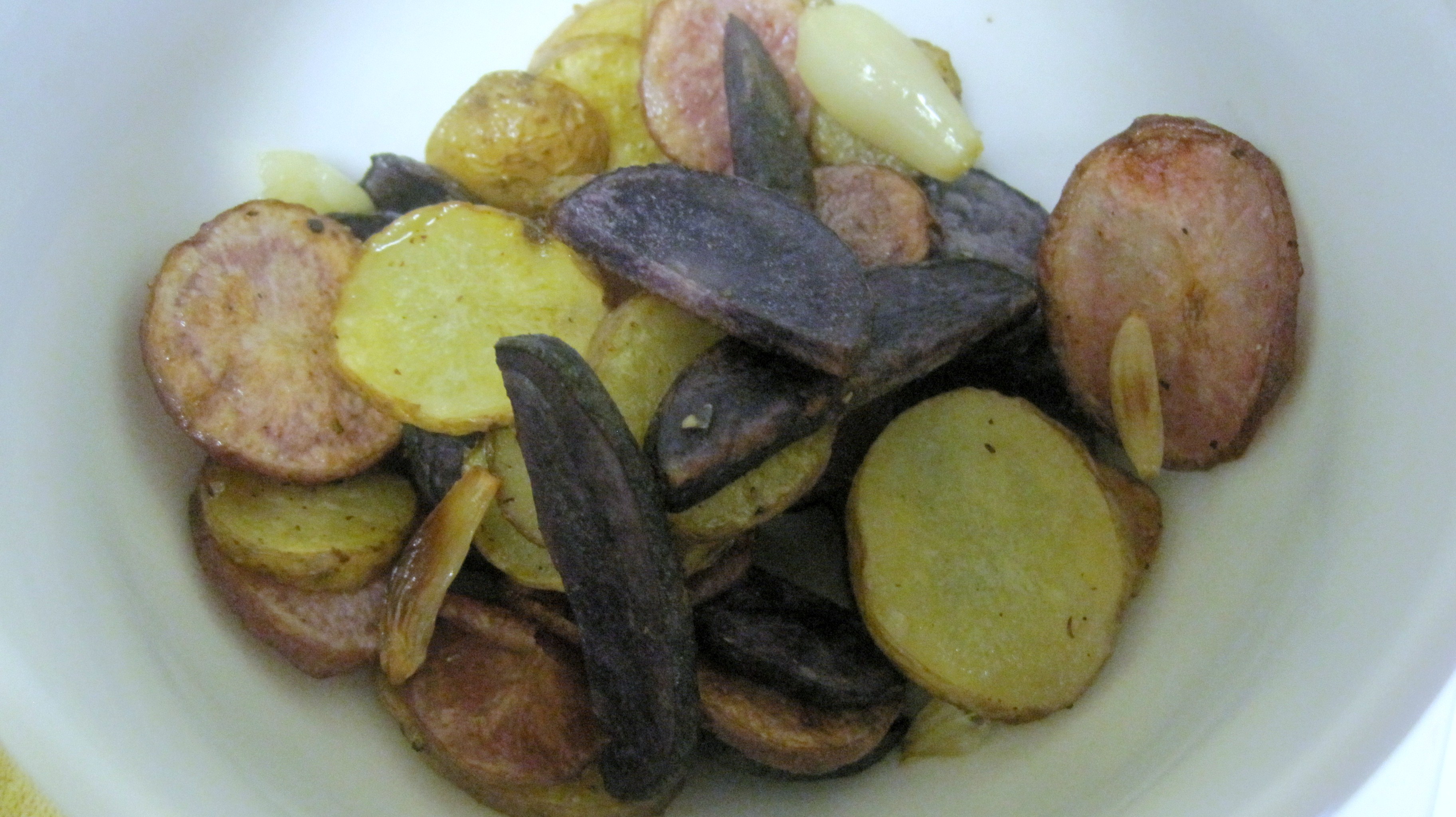 I had a crazy busy work morning and I ran over to Carl’s Jr. for a diet coke on my lunch break. For a moment I wanted fries but then I remembered these wonderful multicolored potatoes and I saved my potato fix for later. I also had brussel sprouts and a small leftover portion of pasta.
