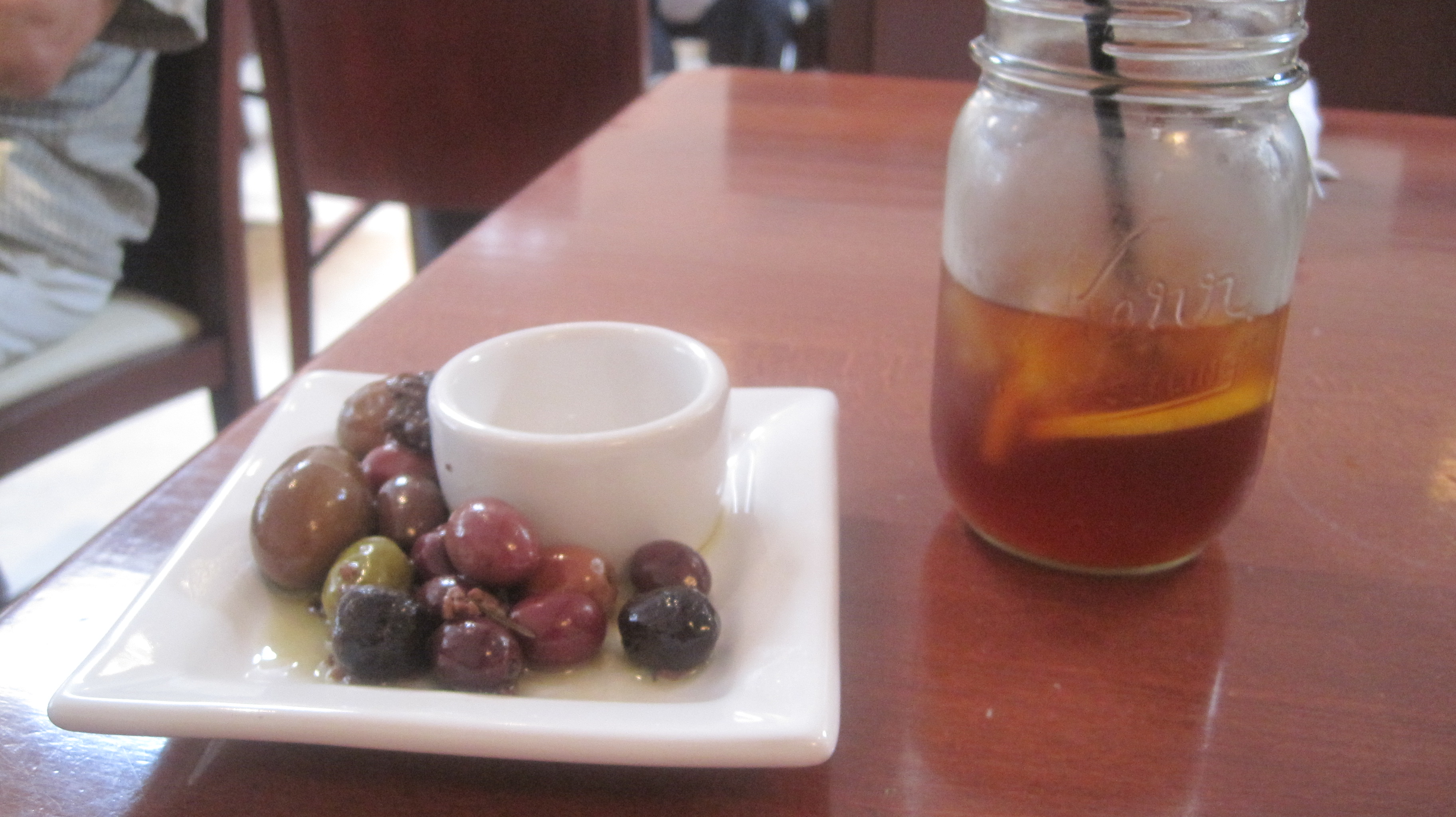 I really love the vibe here! All the sandwiches are $10 and under but you still get to sit down and be served which is just what I needed today. I had no problem getting a table, but the restaurant wasn’t empty. This is a great place to dine alone with a book. The service was excellent and right after I sat down I got some olives and the iced tea that I ordered.