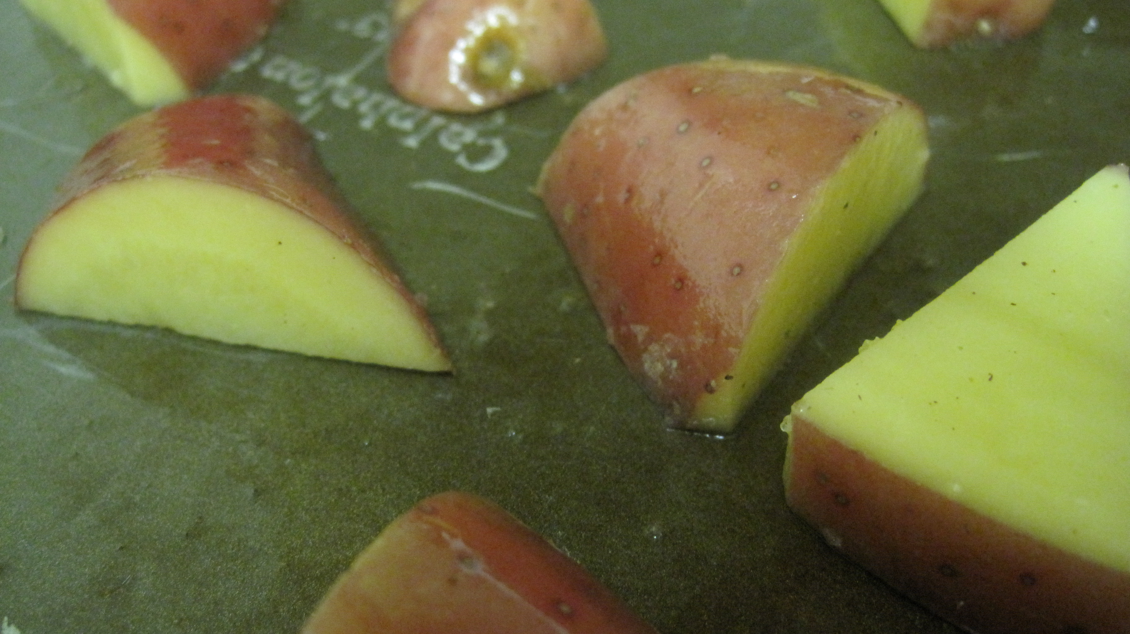 First things first: start the potatoes. Like I always do, chop up, add S&P and EVO. Toss and place in an oven heated to 350 degrees. Let it be while you prep the other food.