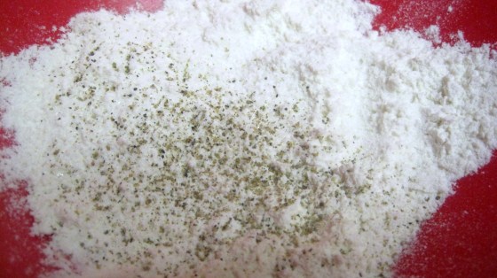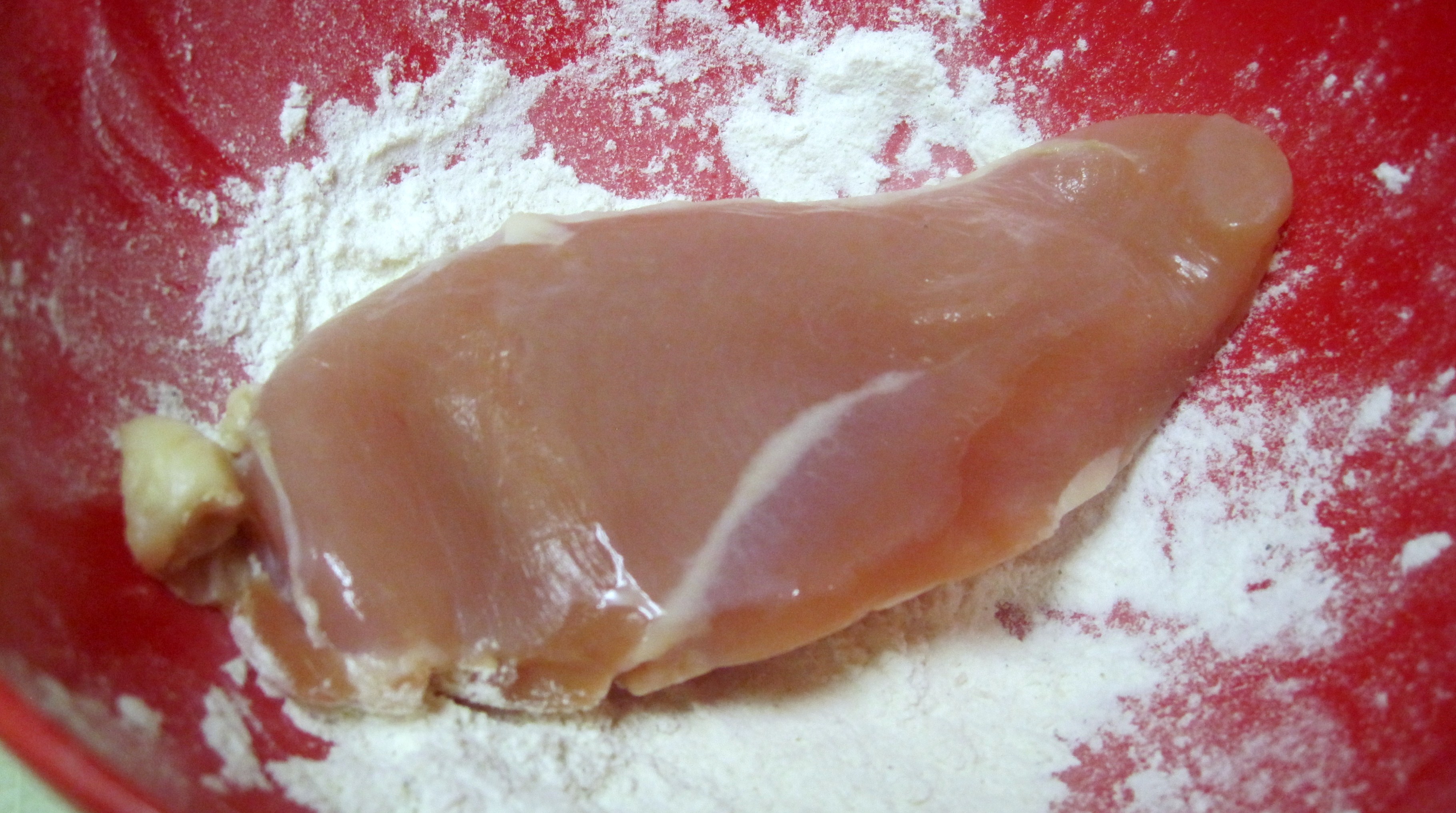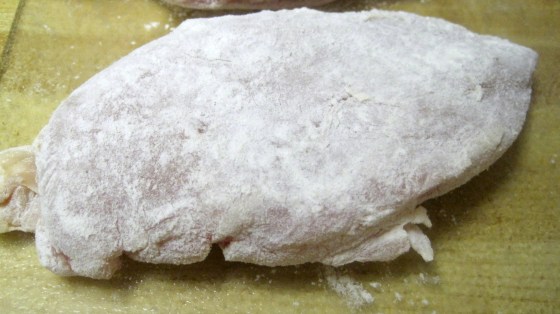 Mix it up and coat both sides of the chicken. Make sure the excess is knocked off.