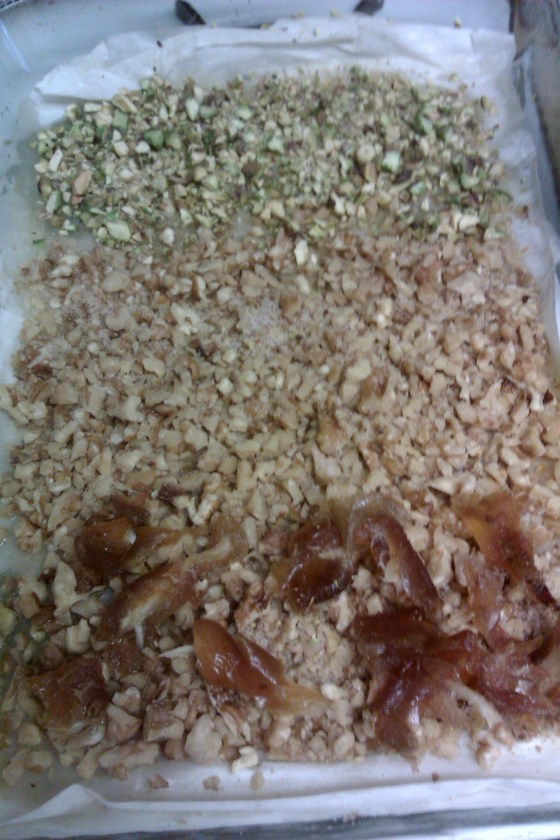 Melt the butter. Unroll the phyllo dough. Be careful! Keep the dough covered with damp towels at all times or it will dry out! I used a casserole dish that is the same size as the phyllo dough. If yours isn’t the same size you will want to cut it down. Lay a layer of phyllo dough in the dish and brush the melted butter on the sheet. I used by fingers, it was like finger painting with butter! Repeat this 4 times alternating butter and phyllo. Then, layer half of the nuts and dates as you wish! Continue layering the phyllo with the melted butter for two more layers. After adding two more layers of butter and phyllo add the second half of the dates and nuts. Top with four more layers of butter and phyllo dough. Make sure that you generously apply butter to the top layer of the phyllo dough.
