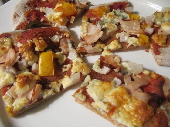 This pizza had onions, garlic, heirlooms, chicken and blue cheese with S&P on whole wheat crust. It tasted so fantastic after a long run!