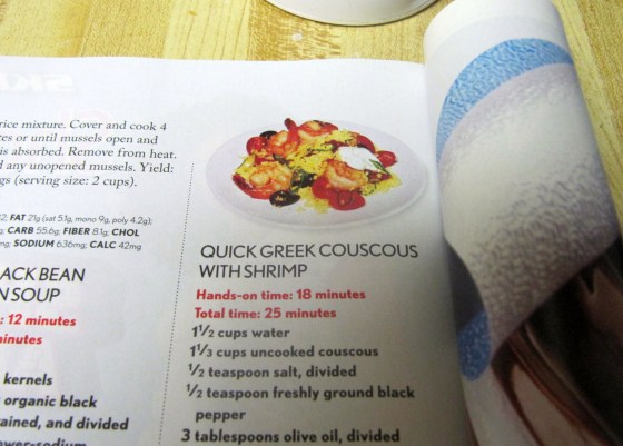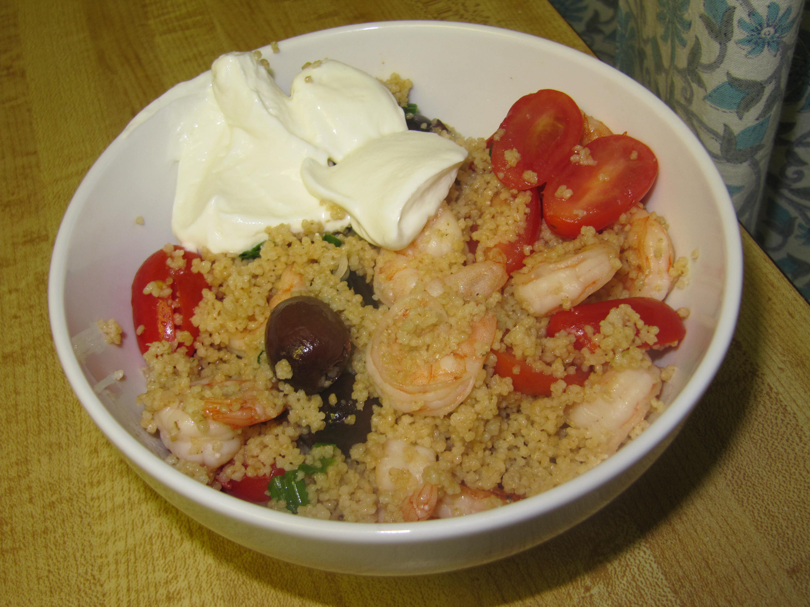 The shrimp cook in about 4 mins. Take off the heat and mix with the couscous. Then add the salad mix to the couscous. Serve with Greek yogurt on the side.