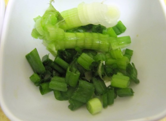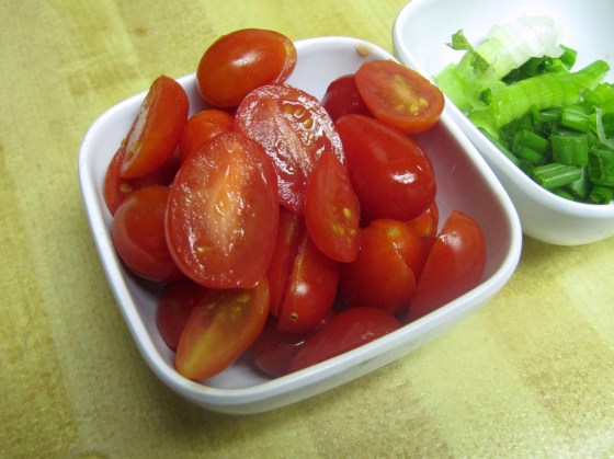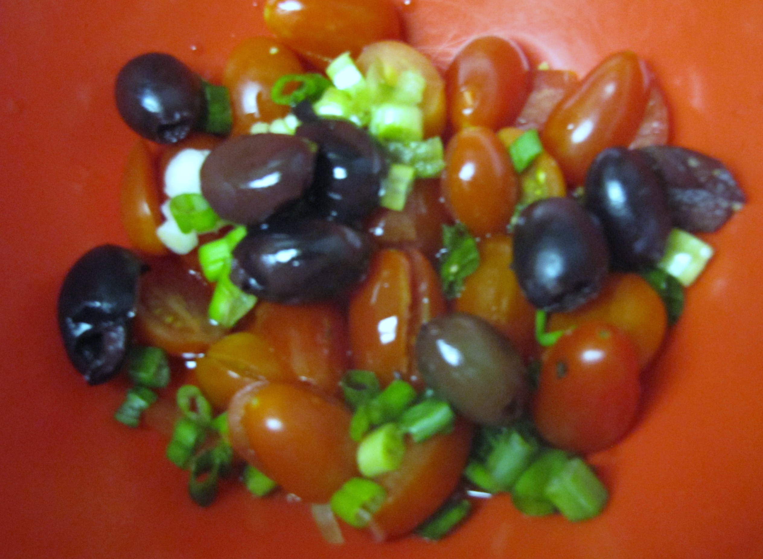 First I prepared two portions of couscous which takes about 5 mins. While it is cooking combine tomato, green onion, olives and a tablespoon of EVO in a separate bowl.