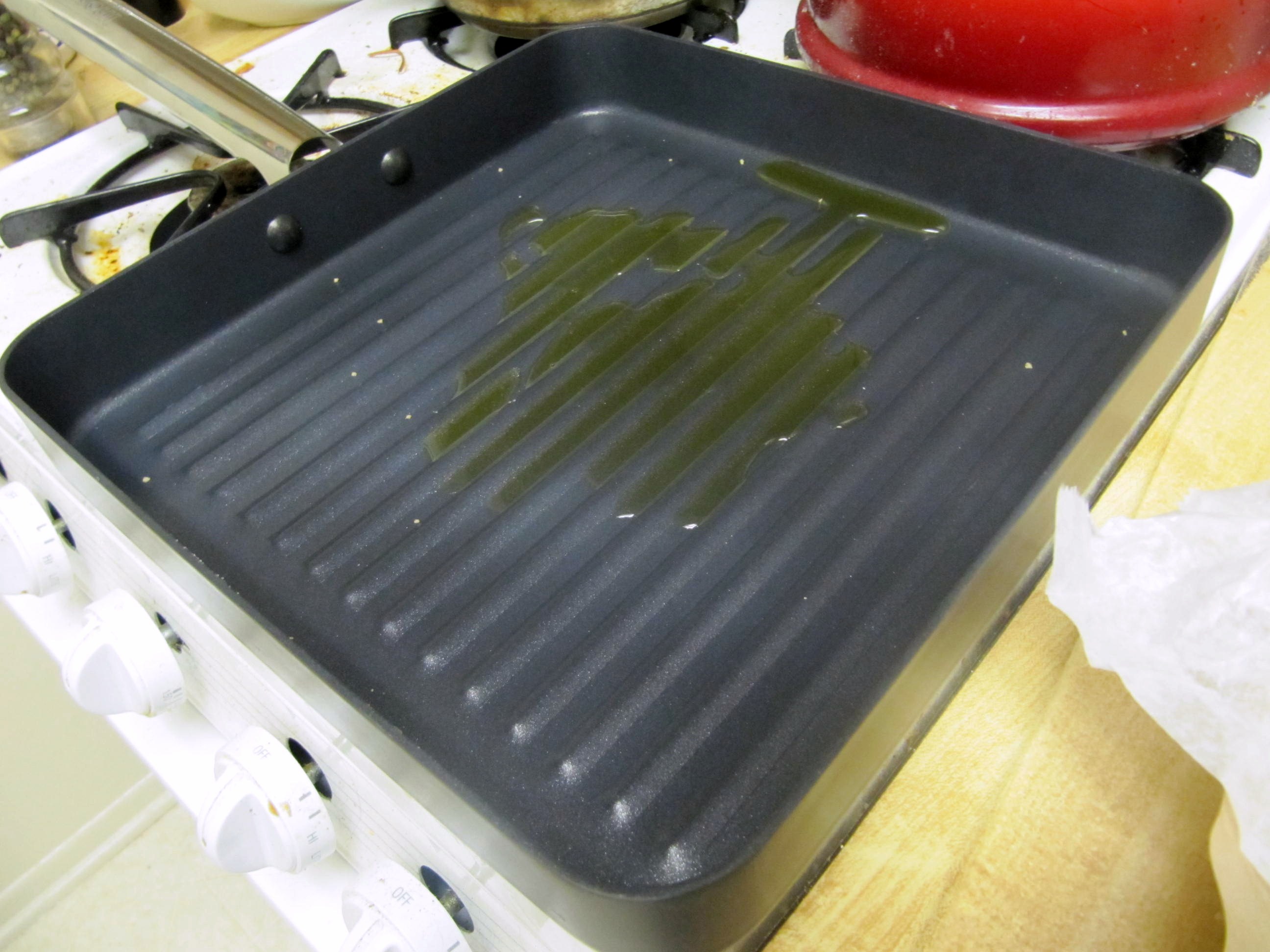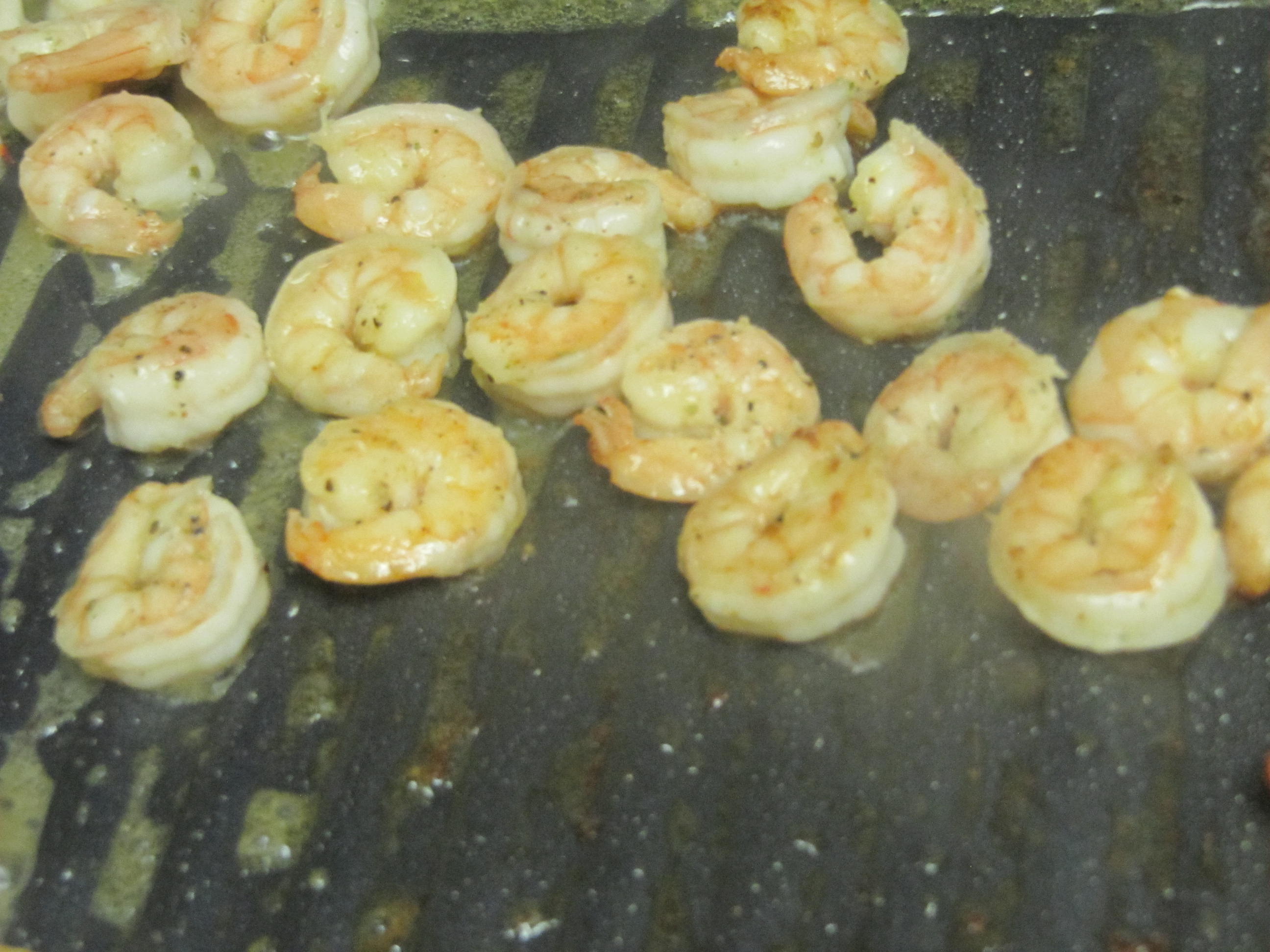 I got my shrimp from the counter at Whole Foods. Why, you ask? I am not a fan of Trader Joe’s shrimp because it is hard to find the de-vained variety. Trust me, no one wants to de-vain shrimp. I got a half pound of the mini shrimp at Whole Foods for $4, which isn’t bad for two servings. I had it packaged for the freezer and defrosted it today. I salted and peppered before grilling in my brand new grill pan. Thanks mom!