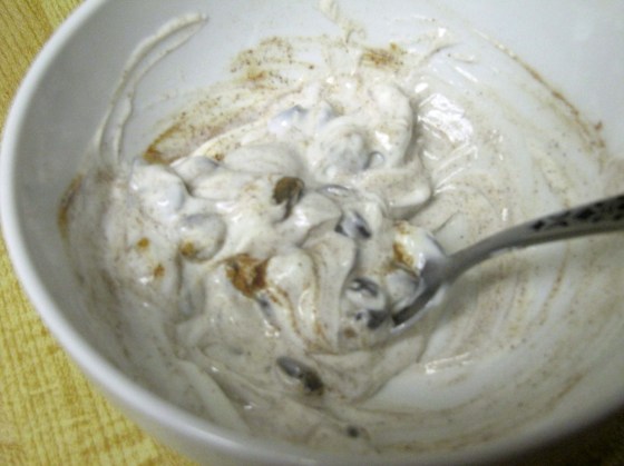 I used Greek yogurt, chocolate chips, cinnamon, and honey. It was a pretty delicious (and healthy) dessert!