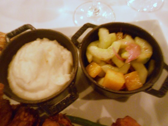 To start, compliments of the chef, we had duck confiet on crostini. The pic is a bit blurry (I refuse to use flash in a fancy restaurant).