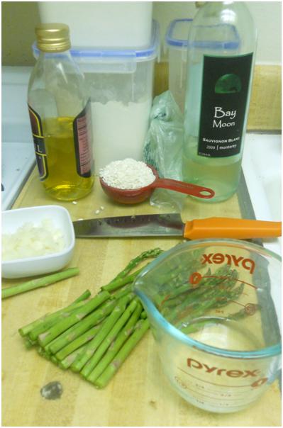 Stir the mixture until the rice has absorbed the wine. Then add the water and raise the heat to medium high. You need to monitor and periodically stir the rice. Observe the rice. Once the water has reduced by half, add the asparagus.