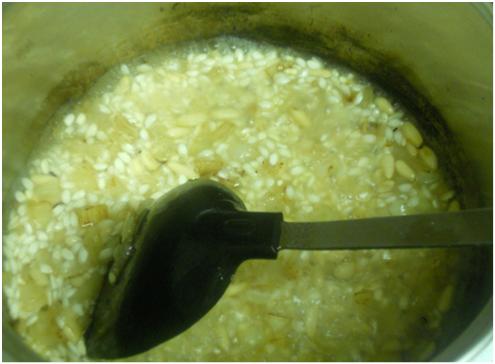 Maintain the medium heat and add the rice. Stir the rice until fully combined with the onion/garlic/pine nut mixture. Once integrated, pour in the white wine. I used a Sav Blanc in this dish, but any dry white wine will do.