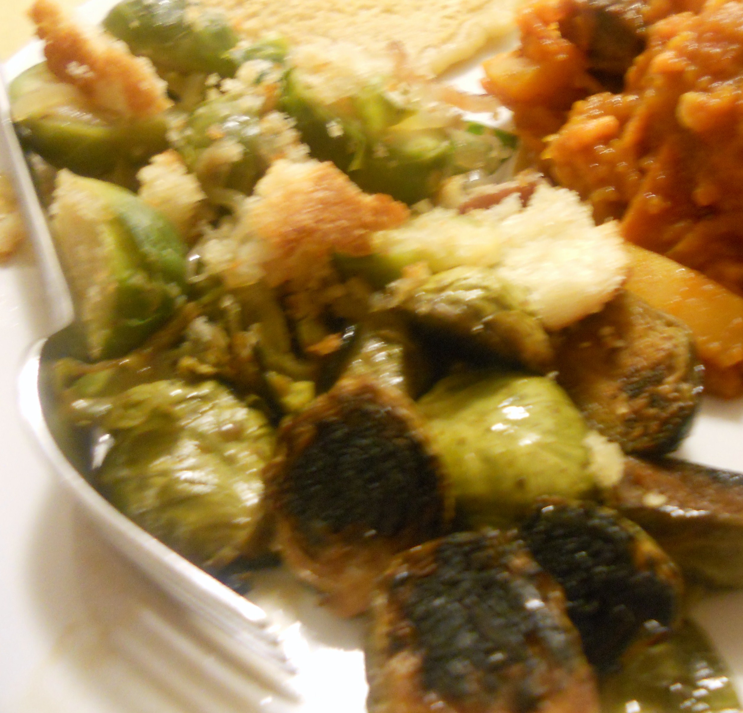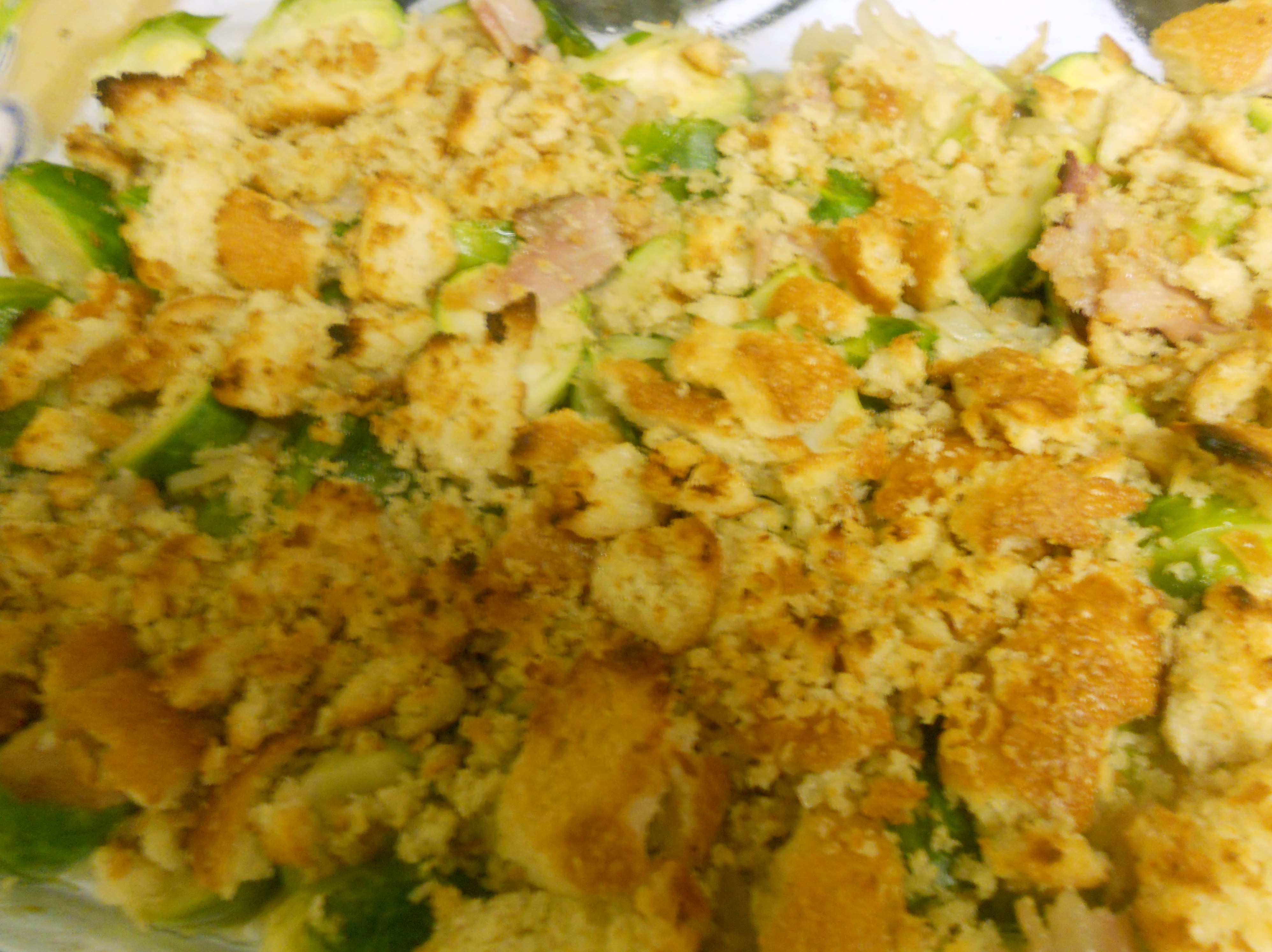 In another pot melt the butter over medium high heat. Add the rest of the salt and the bread crumbs to the butter and saute, stirring frequently until lightly toasted. This takes about 2 mins. Sprinkle the bread crumbs on top of the sprouts.