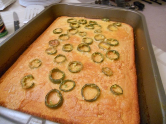 Corn bread. David used a simple recipe but improved upon it by adding melted cheese and jalapenos on top! We all know how I feel about adding cheese to anything/everything. The bread was warm and delicious.