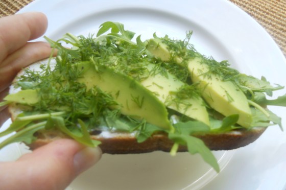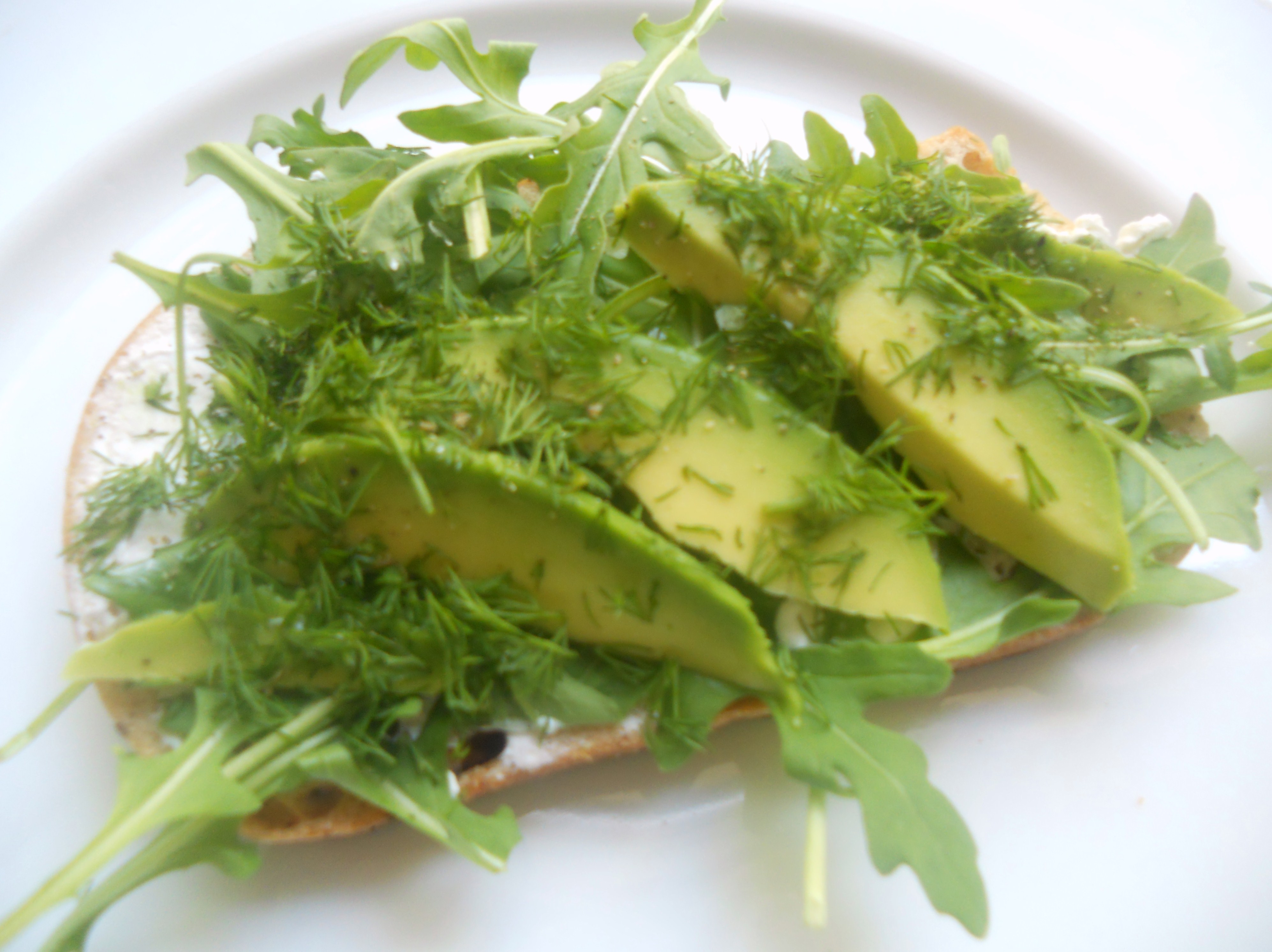 Topped with avocado, arugula, fresh chopped dill, and pepper.