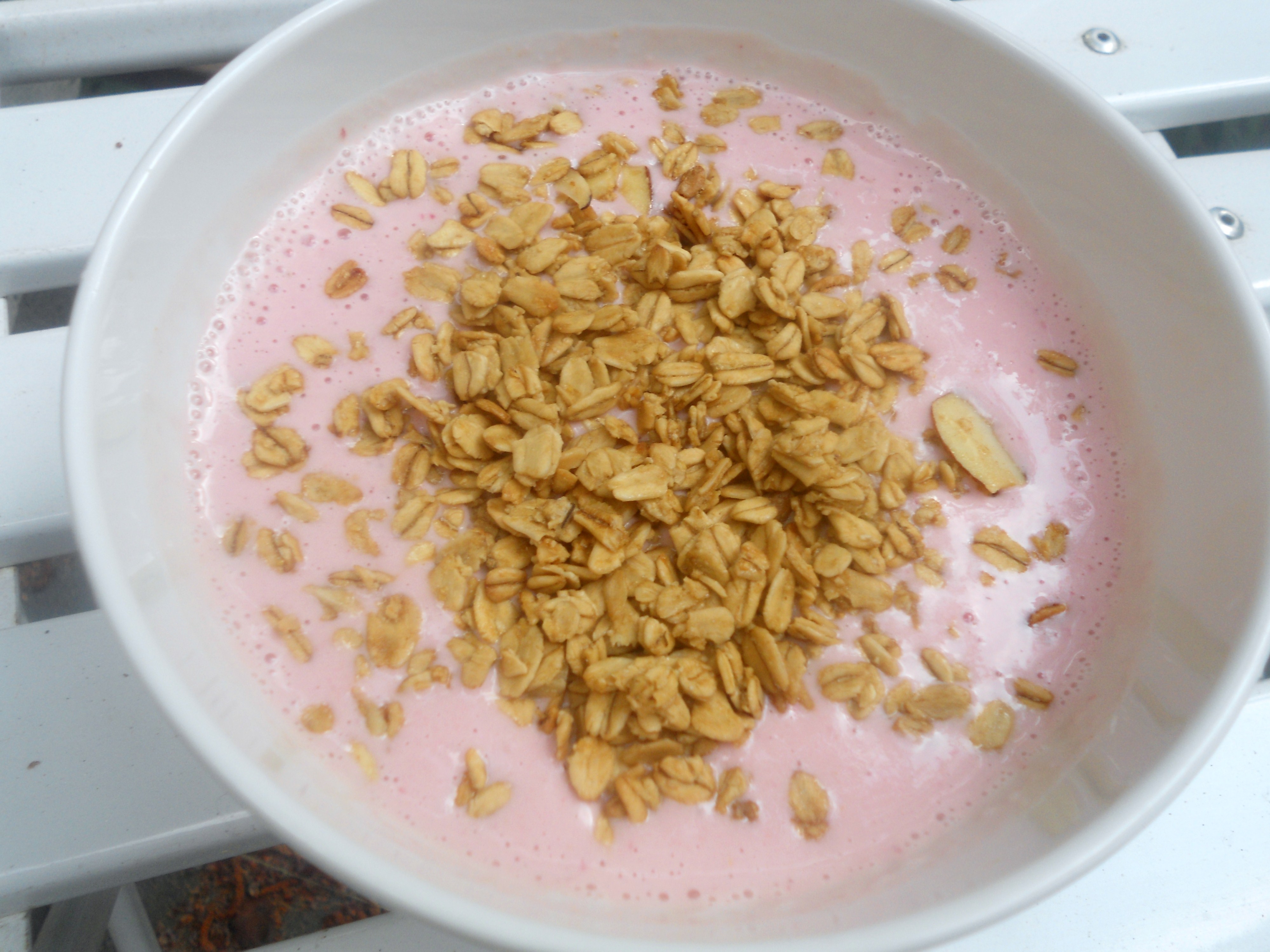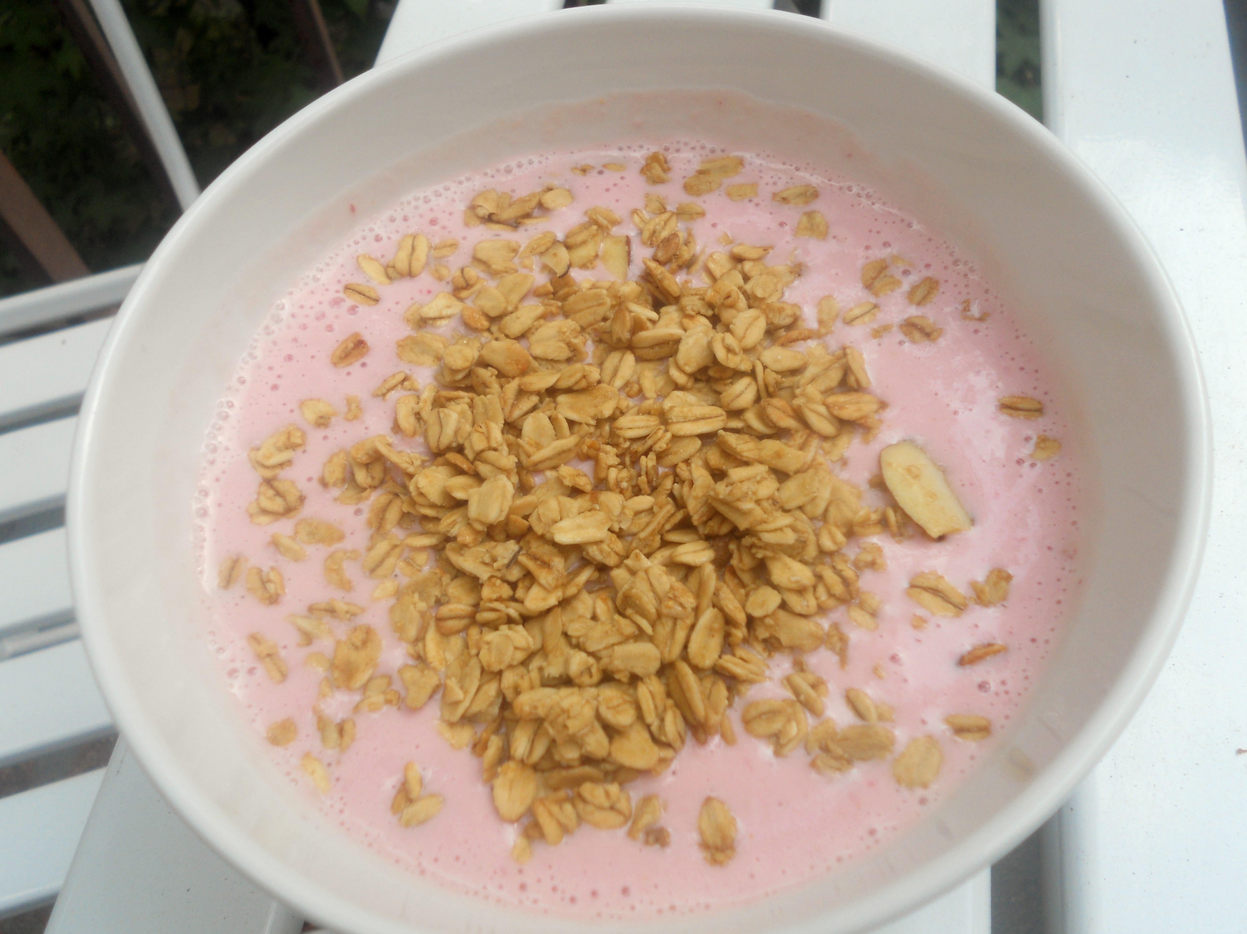 What can I say, I saw farmer’s market strawberries and Greek yogurt. Before I knew it I was throwing things into the blender.