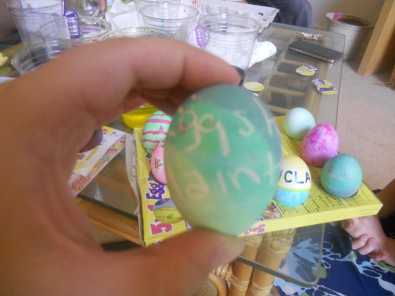 There was an egg that was slightly broken so we wrote “eggshell Plaintiff” on it and dyed it. Law humor represent.
