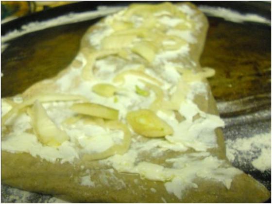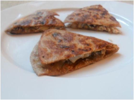I took 1 tablespoon of butter and melted it down at a low heat. Once the butter melted I added 1 chopped shallot. It is very important to cook the shallot and butter at a low heat slowly. Do NOT burn the butter. Seriously, just don’t. While the shallot is cooking take out a quesadilla (I used Trader Joe’s Whole Wheat) and spread it with goat cheese (again, I used Trader Joe’s spreadable goat cheese, but anything will work). Once the shallots are soft and lightly browned transfer the shallot to the quesadilla and set aside. There should be butter left in the pan.