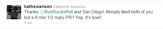 Overall, I had an amazing experience at Rock n Roll San Diego. I will definitely be back for another race! Extra thanks for all the tweets, texts, facebook notes, and blog comments I got during and after the race. You guys are the best!