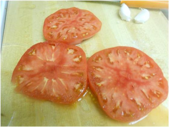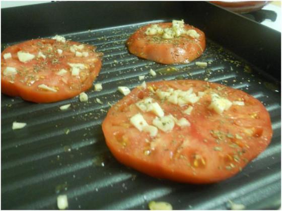 Chop the garlic. Dollop each of the tomatoes on both sides with EVO, salt, pepper, and chopped basil. Take out your grill pan and crank up the heat to medium high. Place the tomatoes on the pan with the garlic like so…