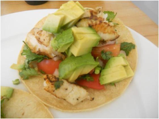 After the fish was done grilling I assembled my tacos. Fish on the bottom followed by toppings and I topped it off with avocado.