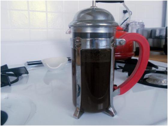While the pound cake was baking I got cracking on the coffee reduction. To start, I brewed 3 tablespoons of coffee in my French press, using 1 1/4 cups water.