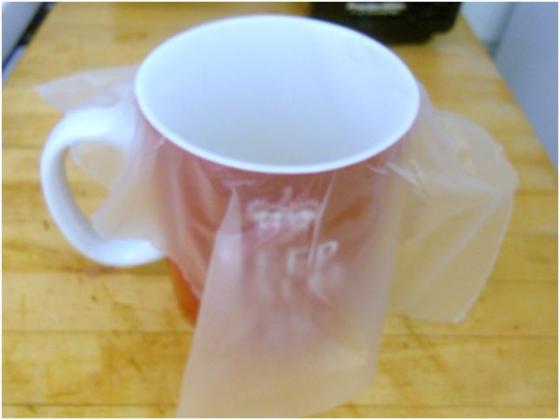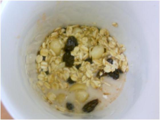 I combined 1/3 cup oats, a sprinkling of cinnamon, a dash of vanilla, some raisins and macadamia nuts in the mug.