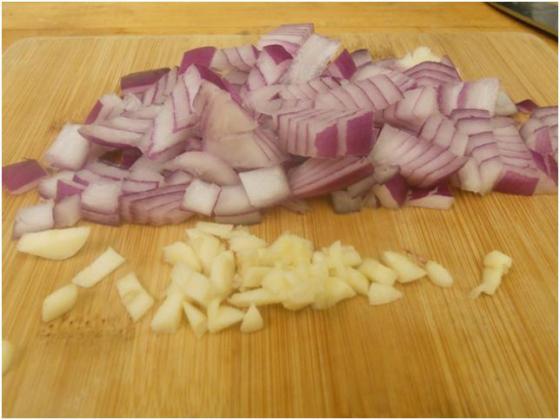 Chop your onion and garlic. In a large skillet heat the olive oil to medium heat. Add the onions and sauté over medium heat until translucent.