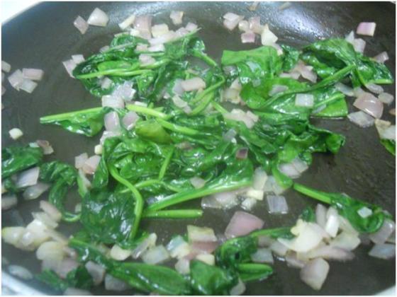 Add the greens and some salt and pepper to the onions and garlic. Stir in.