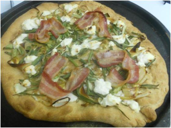HOWEVER, I was back at Mozza with my mom during spring break. We sat at the counter overlooking the pizza oven and was able to watch all the pies being made. The recipes are available from the Mozza cookbook so I don’t feel that bad blogging it. Obviously we jumped at the opportunity to order the Bacon, Leek and scallion pizza. I watched them make the pie and then I diligently attempted to recreate it. While not a total match I think I did a pretty good job.
