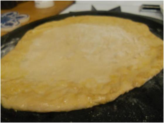 Pre heat the oven to 425. I let the dough sit out for 10 minutes to warm up and loosen. Then I used flour to spread it out and brushed the sides with extra virgin olive oil. I set it aside.