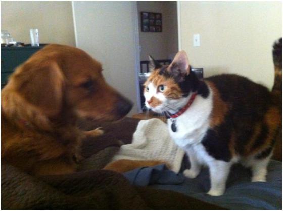 I’m not sure Izzy and Rudy agree. Both of them had lived with the other species before we made the big move and they had also met each other before. On the day of the move Rudy went to day care to tire him out and get him out of the way. Izzy moved in first and had some time to get the lay of the land before Rudy came home. So far they mostly seem suspect of each other. Izzy could run the show if she wanted to but mostly she hangs back and watches Rudy. They spend a lot of time side by side but not interacting. I’m sure this will change over time and we’ve had to train both of them to live with each other. Izzy was trying to eat Rudy’s food, Rudy was eating Izzy’s food and digging around her cat box but I think we mostly have figured out how to stop that behavior.